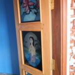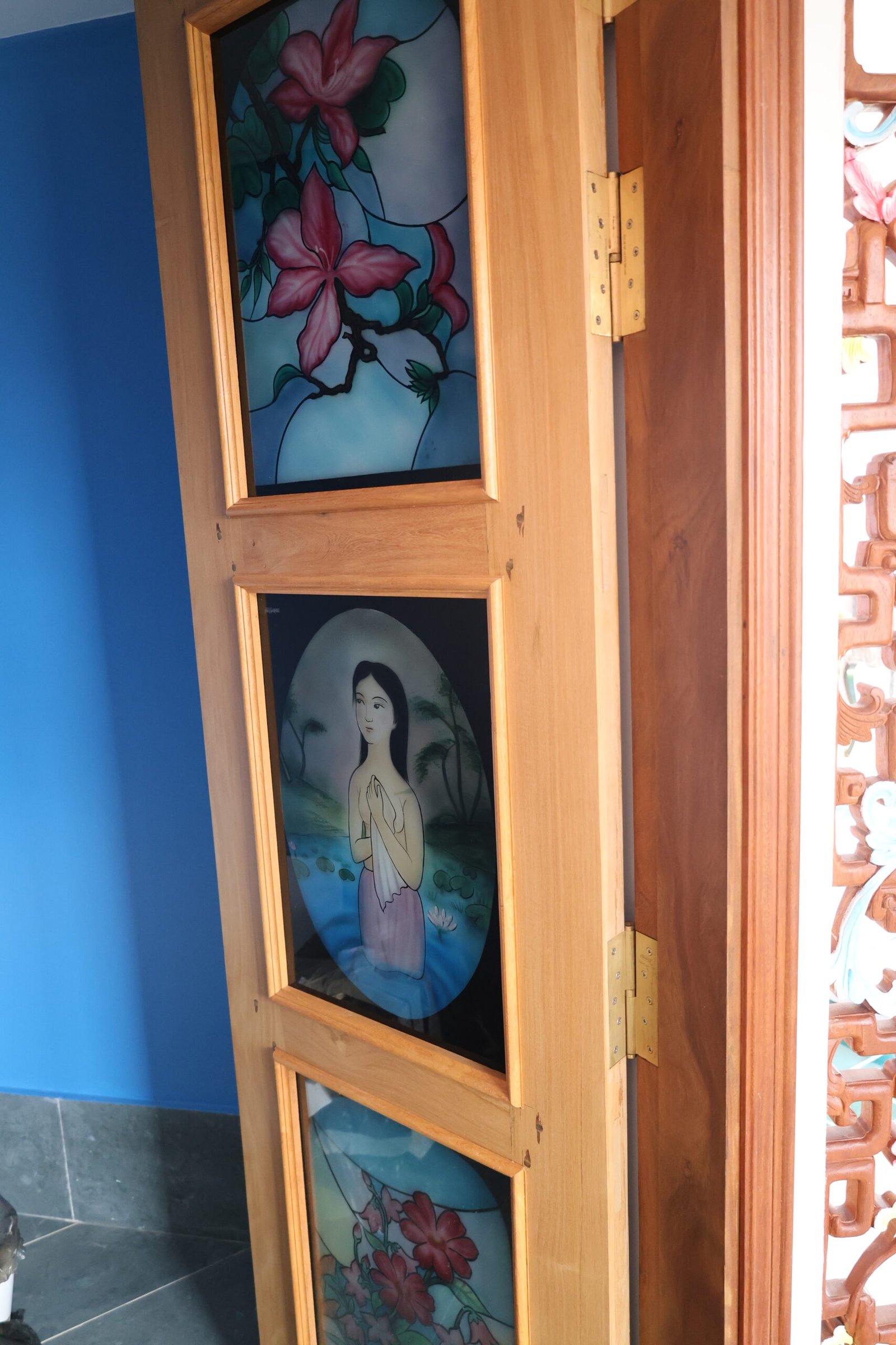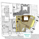 - A central, second level (first floor) bedroom (25 m²) with a 160 cm bed, copper bathtub, stone lavabo, and balcony set behind a large stained-glass panel.