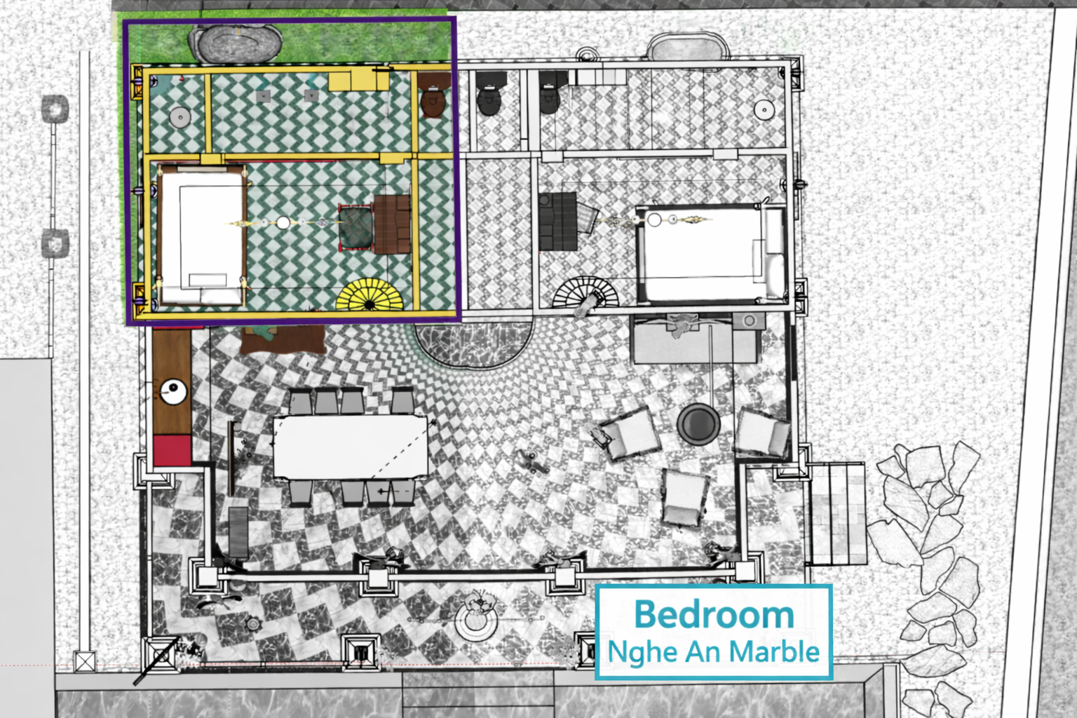 Turquoise tones, 32 m², enclosed ancient-style bed, and built-in Bát Tràng ceramic bathtub. Read aesthetical description